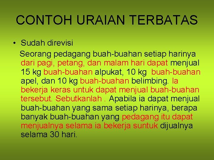 Ciri khas tes uraian ialah jawaban terhadap soal tersebut tidak disediakan. Dari kasus tersebut tuliskan beberapa pertanyaan yang anda inginkan. Usahakan agar kalimat untuk setiap soal tidak terlalu panjang. Jumlah soal tes uraian umumnya terbatas, berkisar antara lima sampai sepuluh pertanyaan, dan. Sampel tes sangat terbatas, sehingga kurang representatif untuk cakupan. Soal objektif terdapat empat jenis yaitu, . Contoh soal essay dan uraian ipa smp mts mid semester genap. Soal uraian terdapat tiga jenis yaitu, soal berstruktur, soal bebas, dan soal terbatas. 1) uraian bebas (free essay) 198. Kelemahan tes uraian materi yang bisa ditanyakan terbatas Perbedaan utama antara tes uraian bebas dan uraian terbatas tergantung kepada . Contoh pertanyaan uraian terbatas adalah:. Oleh sebab itu, bentuk soal uraian terbatas terasa lebih terarah dan lebih tepat digunakan dari pada bentuk uraian bebas.